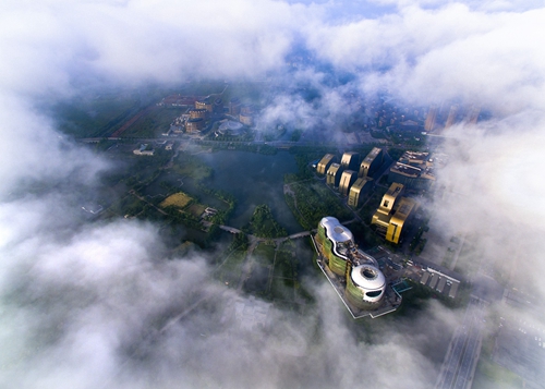 微评:美丽中国,杭州样本。杭州的美,在于自然,在于产业,在于城市化发展与自然的完美结合。白马湖创意小镇就是其中之一。五月的杭州,有点像娃娃的面,说变就变。昨天晚上刚下的雨,今天就艳阳高照。一阵风来,山上的雾气被吹散。作品正是在这个稍纵即逝的时刻抓拍到的,前后只持续了几分钟。我在近百张航拍照片中挑选了这张白马湖创意小镇,其中正在施工的建筑是白马湖动漫博物馆,它的设计理念就是引用了“云”的概念,天空中的云雾好像被开了一个天眼,与下面的小镇相互呼应。让人由衷感叹美哉,杭州,美哉,中国。