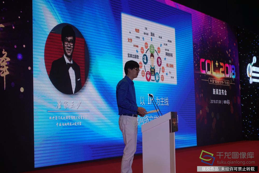 7月8日上午,2018第二届中国“网络文学+”大会新闻发布会在京举办。图为著名网络文学作家唐家三少发言。 千龙网记者 陈晨摄