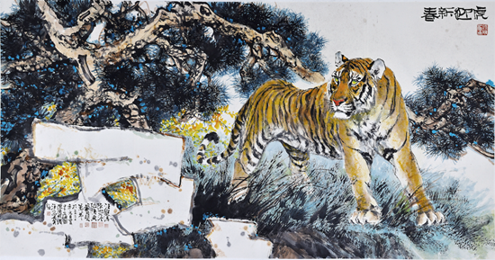 陈家泠先生现场介绍道,《虎迎新春》是集体创作,希望通过老虎将中华民族的雄风展现出来,老虎的威猛也象征我们中华民族的自信心,盼望冬奥会上的运动健儿们,有虎一般的气势;画中的石头,则代表我们的民族坚如磐石,是有凝聚力的;松柏常青,代表我们的民族有生气,欣欣向荣。