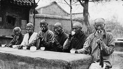 几位老人坐在石桌旁,他们曾经是八旗士兵。旧京旗人构成了一个独特的文化圈子。
