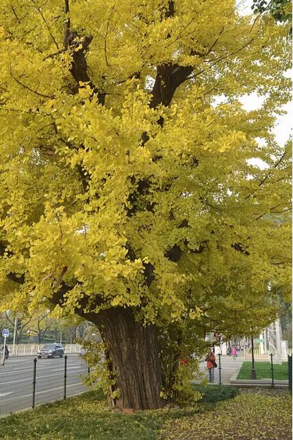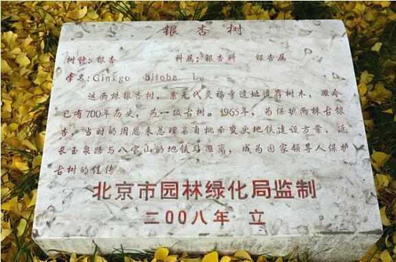 再说这两棵银杏树,更是了不得,绝对的明星,为保护它们,周总理亲自批示更改地铁建设方案,延长站距。为什么呀?它们可是已有700年历史的古树,是元代灵福寺遗址的遗存树木。
