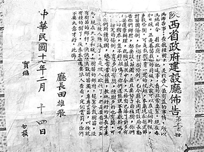 笔者在收藏的旧书中无意间翻出一张民国植树布告,见证了那时代人们植树的情怀。这是一张陕西省政府建设厅于民国十七年(1928年)发布的植树布告,布告宽62CM,高64CM,采用了当时常用的竹纸材质。布告全文共三百余字,内容主要是鼓励和提倡人们植树护树,遵照条例和法规积极种树,同时也指出对当时种树的成果进行严格赏罚制度,告文简洁明了。落款为“厅长田雄飞,中华民国十七年二月十四日,实贴,勿损”,还加盖红色建设厅印章。建设厅一号公告为植树,可见其重视程度。