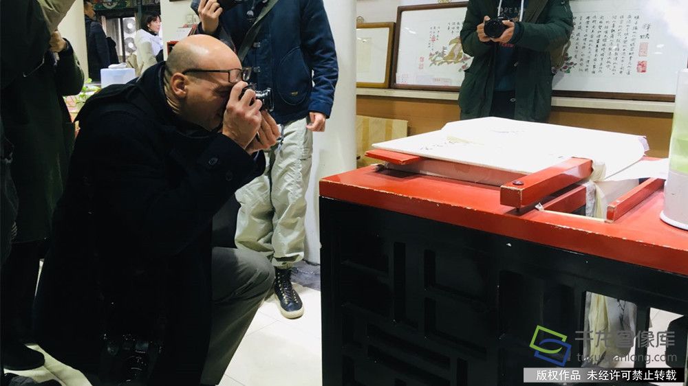 11月15日,“丝路大V北京行”文化篇启动。图为参访团成员拍摄木版水印制作过程。千龙网记者 王焕摄