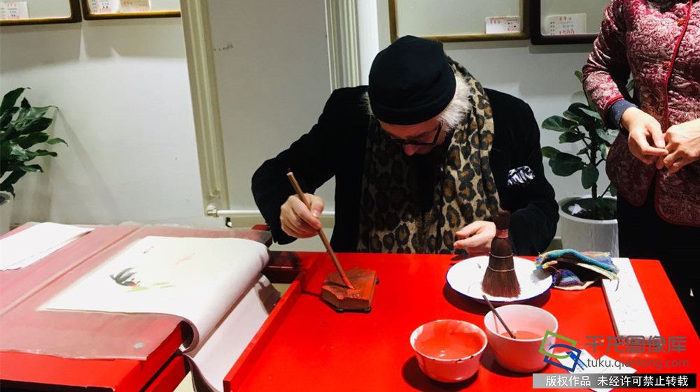 11月15日,“丝路大V北京行”文化篇启动。图为参访团成员体验木版水印制作过程。千龙网记者 王焕摄