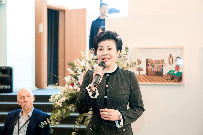 "灯塔——平行世界"国际孤独症儿童绘画展于2019年4月2日在中央美术学院设计学院展厅正式开幕。图为中国少年儿童文化艺术基金会会长阚丽君致辞。
