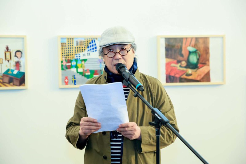 "灯塔——平行世界"国际孤独症儿童绘画展于2019年4月2日在中央美术学院设计学院展厅正式开幕。图为中央美术学院设计学院院长宋协伟主持。