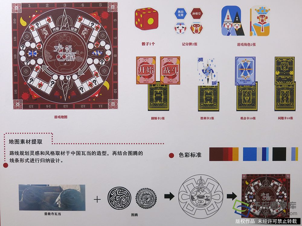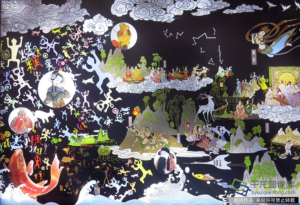展览中既有运用象征表现手法的创作,比如插画《戏韵流芳》把戏曲从萌芽、雏形、发展到繁荣的各个阶段,用散点透视的手法一幕幕展现给观众。在设计中,有灯火、神鹿、祥云等抽象的符号设计,画面华美典雅,表现出戏曲艺术薪火相传,生生不息的寓意。