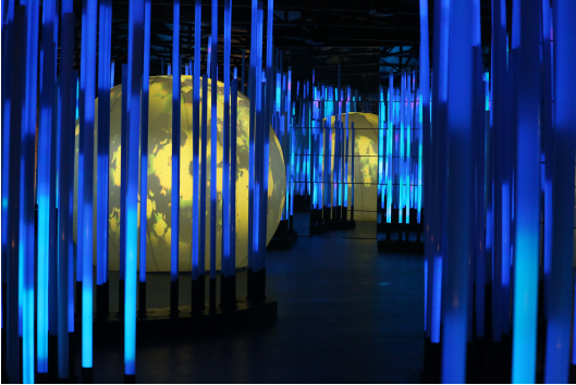 HALO PARK 光楽园™联合世界多媒体艺术之都-加拿大蒙特利尔艺术家参与创作4款多媒体灯光作品。包括月光花园、音乐巴别塔、光感互动球和森林迷宫。其中森林迷宫为光楽园主创团队与蒙特利尔艺术家共同创作的镜面沉浸体验空间。观众仿佛置身一个无边界的竹林灯海,竹灯色彩随音乐起伏,中心的投影球讲述了一个关于森林和生命的奇妙故事。