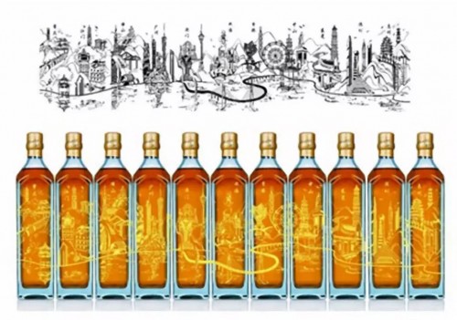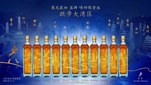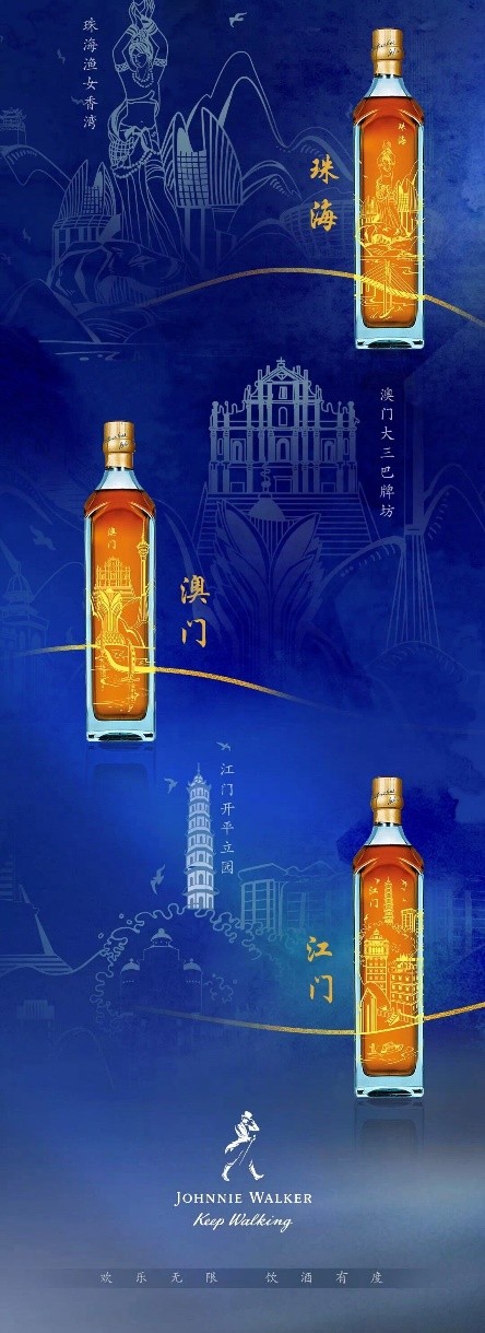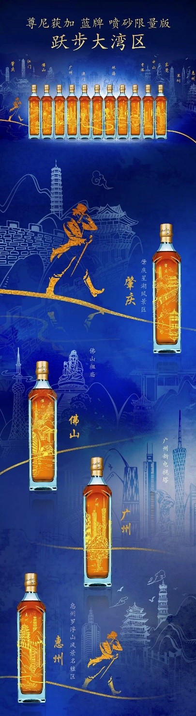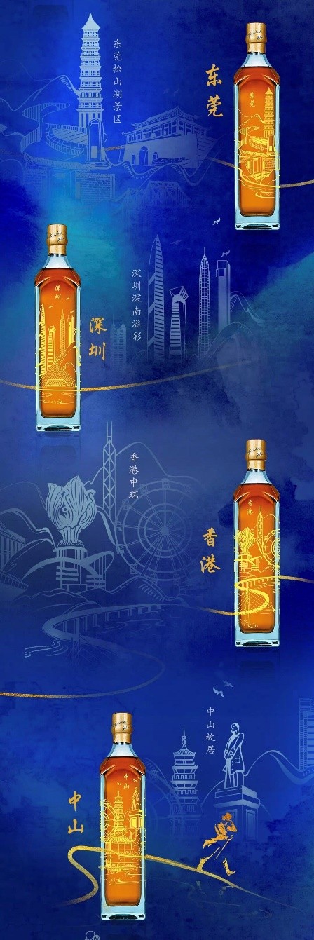 尊尼获加蓝牌大湾区喷砂限量版,由11瓶绘有大湾区城市群为主题的尊尼获加蓝牌组成,香港、澳门和广州、深圳、珠海、佛山、惠州、中山、东莞、江门、肇庆,依次排列,由东向西,宛如一串灿烂夺目的珍珠。