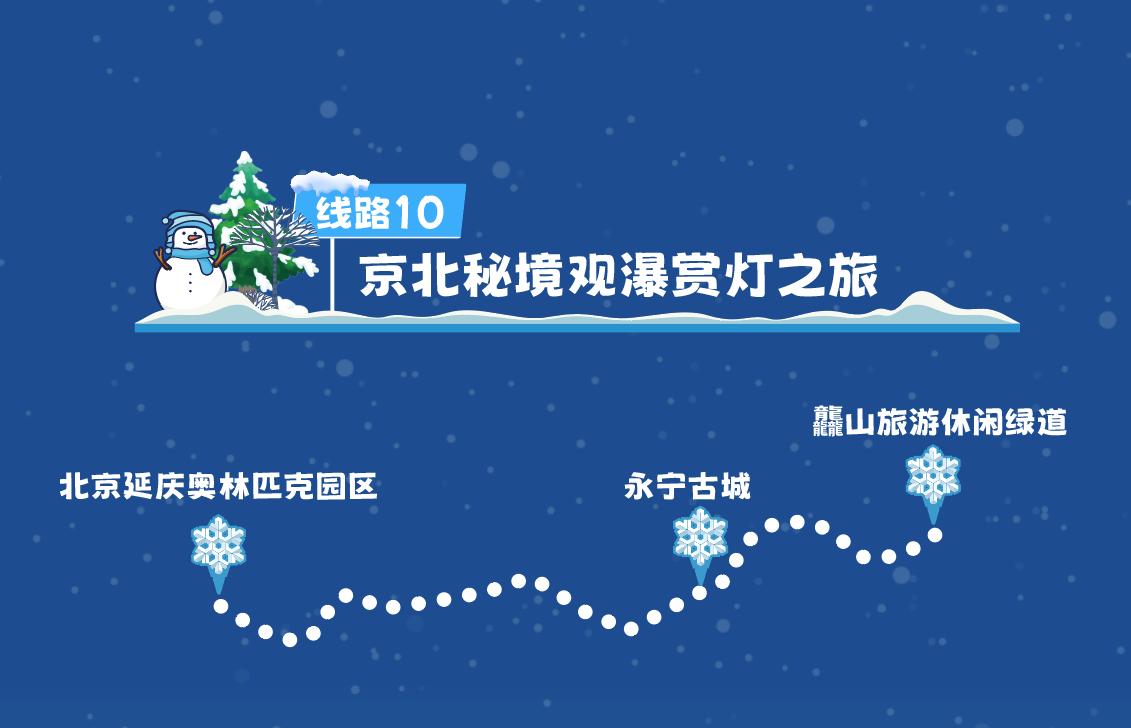 京北秘境观瀑赏灯之旅深入延庆奥林匹克园区,体验“雪飞燕”的速度,逛永宁古城非遗市集,漫步龘山绿道,并可顺路欣赏龙庆峡的璀璨冰灯。