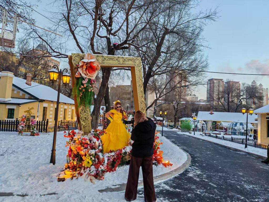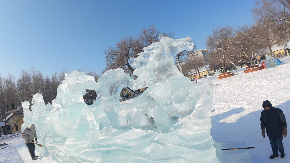 一踏入街区,一座长达15米的冰雕《八骏图》横亘街巷,晶莹剔透的骏马仿佛从黄房子的历史深处奔腾而出,阳光穿透冰体,折射出彩虹般的光晕。散布各处的8座冰雕小品,或是俄式套娃,或是芭蕾舞者,构成奇妙的视觉和弦。