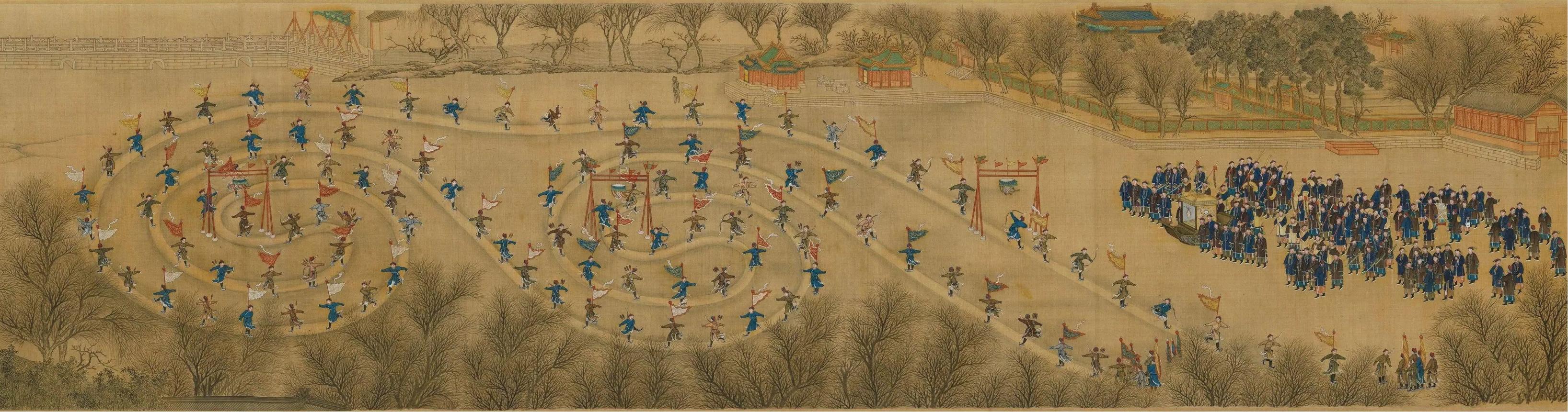 冰嬉庆典伊始,由八旗兵组成的庞大速滑队伍首先绕场滑行一周。待皇上完成对队伍的检阅后,各类竞技项目方依次展开。冰嬉项目通常包括抢等、抢球以及转龙射球等,其中“抢等”作为清朝冰嬉大典的核心项目之一,与现代速滑比赛颇为相似,以滑冰速度决胜负。比赛开始前,八旗兵身着箭衣,脚蹬冰鞋,在距终点三里外的起点整齐列队。随着号令声下,他们如离弦之箭般飞速向前滑行,率先抵达皇帝冰床前者即为胜者,并将获得皇帝的嘉奖。