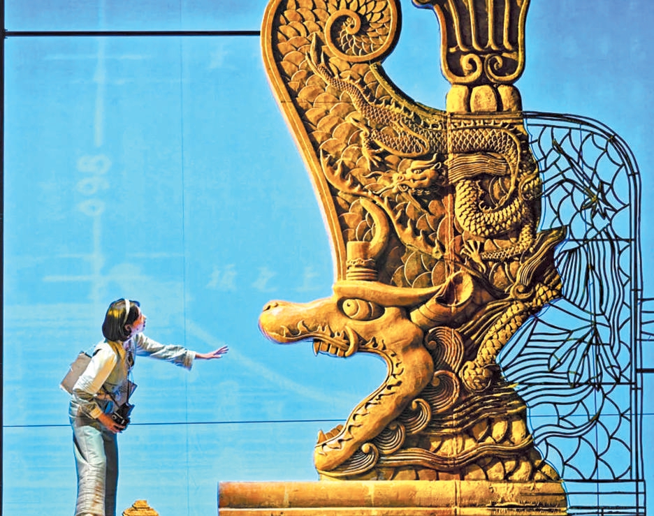 王琛透露,舞台上关键的古建筑构件均严格按照1∶1的真实比例复原制作,当它们悬置于观众面前,一种视觉上的“冲击力”油然而生,“观众能直观体会到剧中人物每日工作的物理尺度和精神重量,体会测绘队员是以怎样的血肉之躯攀爬、丈量并挽留这份巍峨的文明。”舞台地面,北平时期中轴线的建筑脉络化为起伏线条,如纸张般弧形掀起,“寓意着古城文明在战火中飘摇欲飞却又根基深植的命运。建筑的‘实’代表文明遗产,图纸的‘虚’代表传承意志,虚实明暗的衔接过渡,共同凝固了那段惊心动魄的历史。”