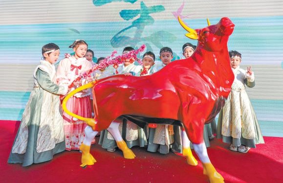 鞭打“春牛”仪式上,人们祈愿新一年五谷丰登。本报记者 邓伟摄
