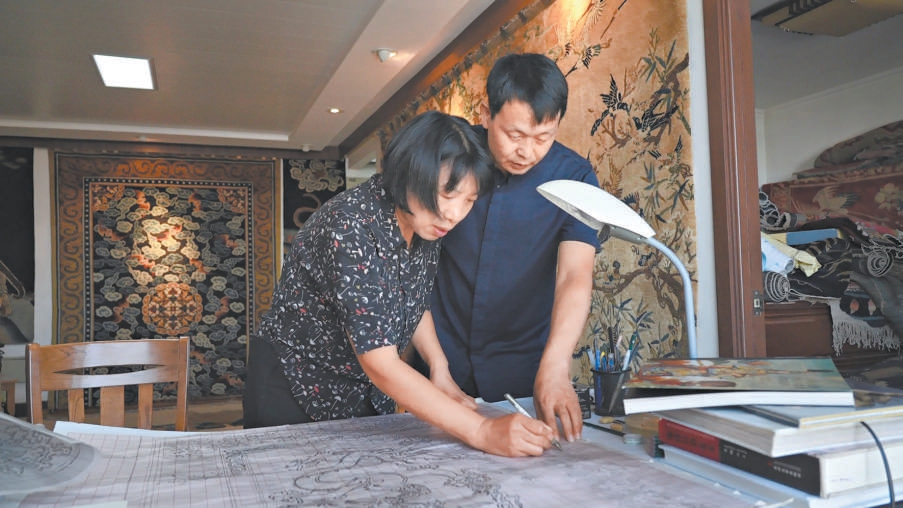 在挂满古毯的工作室里,冀豫、李东阳夫妇探讨选定色调(资料图)。