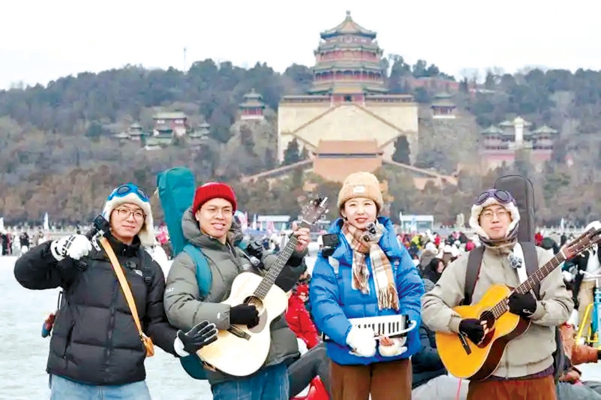 清晨的颐和园昆明湖冰面上,游客络绎不绝。一支背着吉他、拿着口风琴的90后乐队在冰面一角停下简单调试准备,当《时光》的旋律在冰面上响起,有人轻声跟唱,有人掏出手机记录这一刻。这条视频被上传至社交媒体后,迅速被网友刷屏,有人想起在颐和园冰场上的体育课,有人回忆起旧时光……正是这种自然发生的情感“连接”,成为这场演出最打动人心的地方。
