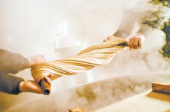 熬成的糖浆先滤干水分,再急火快炒,炒到空气中绽开香甜的糖花就停手,待糖稀接触室温、晾稠以后,就立即开始合作拔糖(“拔楦”)。拔糖时两人对头站立,把整锅糖块拉成三米多长的韧性皮筋状,经过九拉十八折,把宽糖片变成一根中空的“糖管子”。最后的“勒糖”环节犹如变戏法:小心把糖管抬出室外,趁着温度骤降,用一根细麻绳绕糖管一圈,手上带些巧劲,一勒、一断,金黄色的“小南瓜”便落入盛接其下的大竹篾里。双手持竹篾的师傅轻轻绕圈水平晃动竹篾,还带着余温的糖瓜在打滚转圈中便更加饱满、浑圆。刚定型的糖瓜再去炒好的芝麻里打上两滚,非遗特产“莱芜糖瓜”就此圆满完成。本版供图:视觉中国