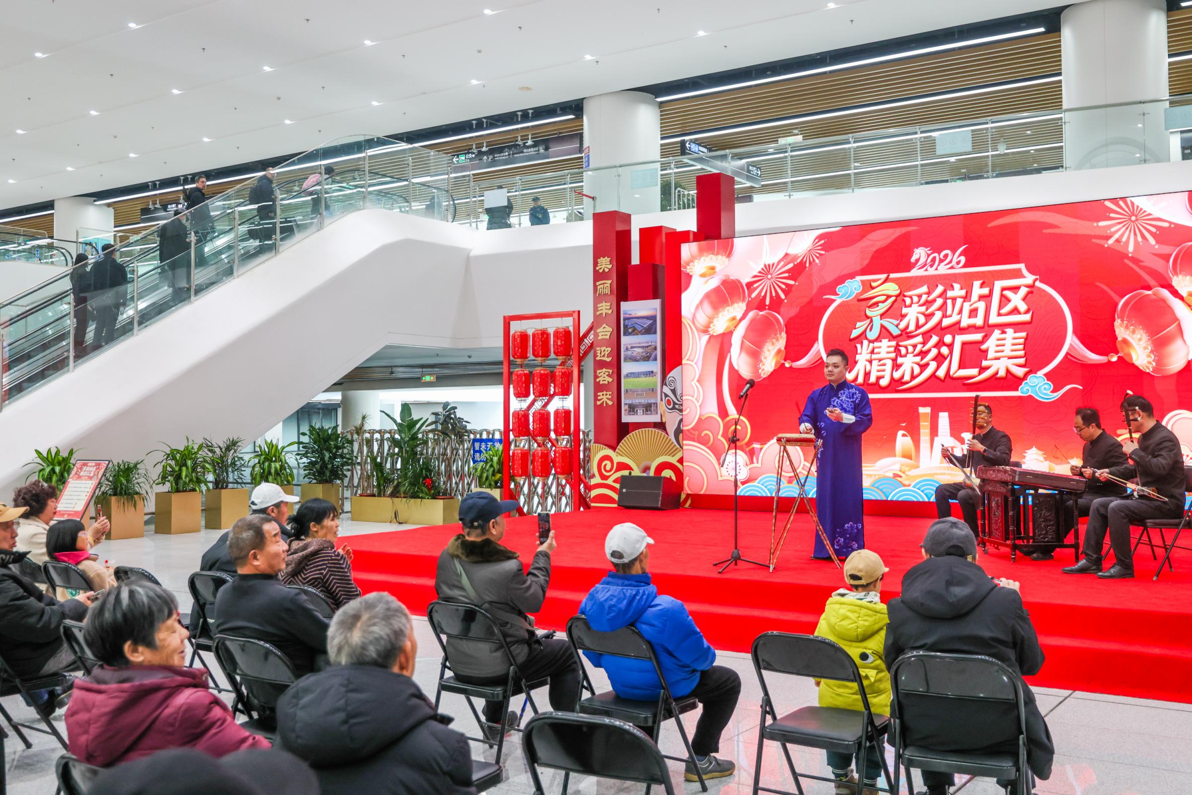 整场表演篇幅精简,但京味儿浓郁、形式丰富:快板书《数说北京》从北京的城门切入,轻松道来老北京的历史沿革;单弦《北京小吃赞》报上连串菜名,把豆汁儿配焦圈儿、涮羊肉、冰糖葫芦的百般滋味唱得绘声绘色;京韵大鼓《重整河山待后生》节奏铿锵,志气高远;北京琴书《长寿村》婉转轻快,寓意祥和……小舞台前的观众越来越多,不少旅客慢下了脚步,也有周边散步的居民循声而至,为演员们喝彩鼓掌。