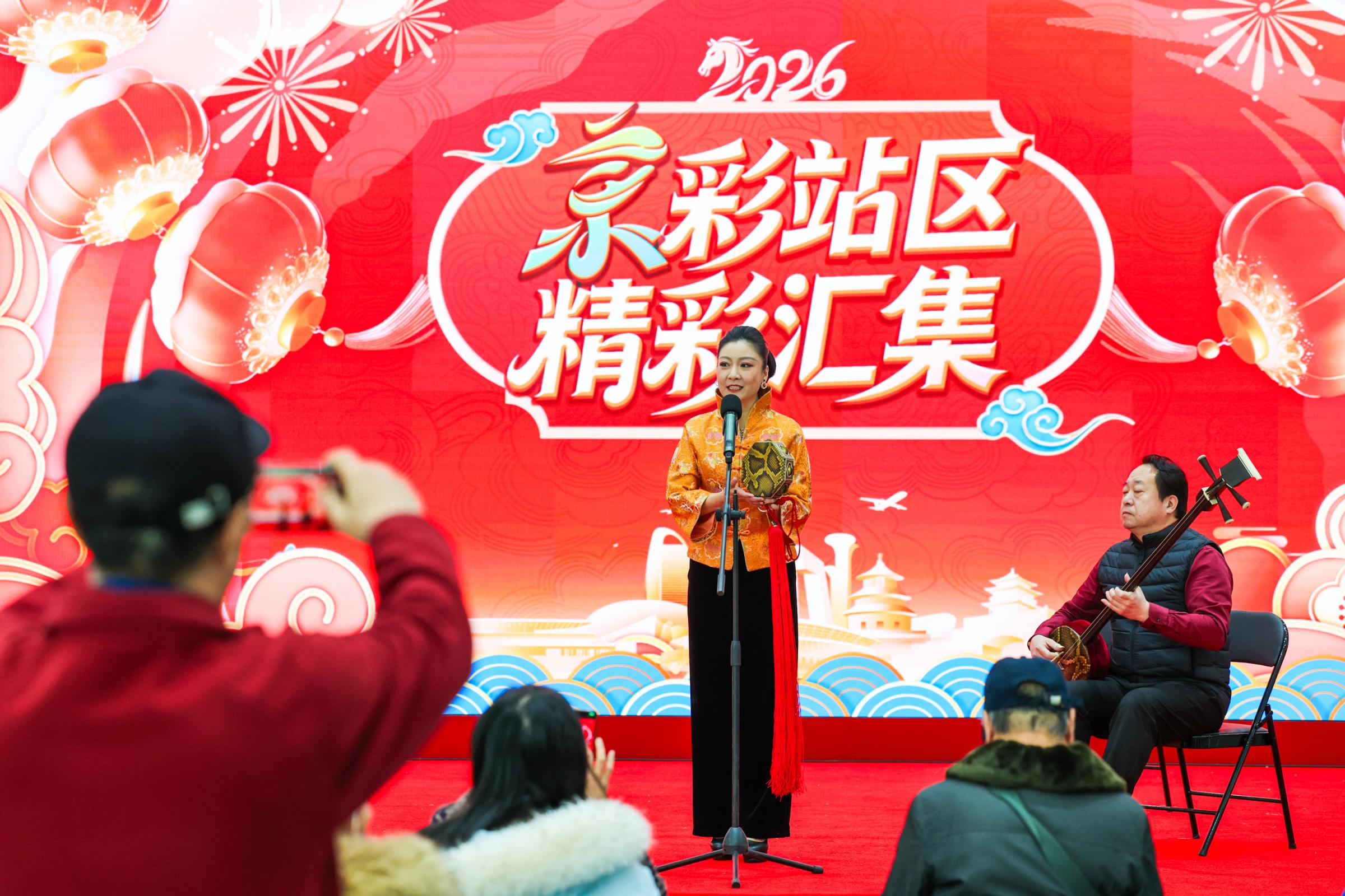 午后,北京丰台站出站口,拉着行李箱的来往旅客被一声热情的招呼吸引了注意。“父老乡亲们,别着急走,往这儿看!”顺着声音望过去,一方喜庆的红色舞台搭在行人必经的电梯旁。快板打响,单弦款拨,2月13日,北京曲艺团为抵京旅客送上“第一站”新春祝福。