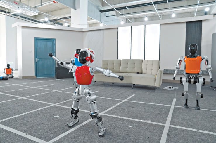 在松延动力复刻的“春晚舞台”上,机器人反复练习翻跟头不出格子。本报记者 王海欣摄