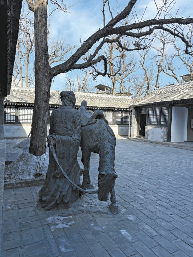 门头沟区的王平镇西落坡村,处于京西交通要道,马致远那首最为人熟知的小令《天净沙·秋思》,据说描绘的就是这里的景象——“枯藤老树昏鸦,小桥流水人家”。今天的故居门前,也是小桥流水的布置。步入故居,灰白的影壁上,“马致远故居”几个大字遒劲潇洒。绕过影壁,是具有元代风格的北方民居四合院。院中立有马致远的塑像两座:一座持书远眺,另一座牵着瘦马,仰天凝望,似在叹喟天涯梦远、教人断肠。
