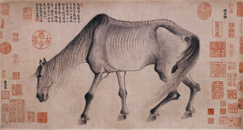马致远应是爱马之人。《天净沙·秋思》曲中的“瘦马”其实同他命运与共。古代文学传统中,马这一意象常与文人自身的遭遇相系。骐骥不逢伯乐,如士不遇知己。杜甫就曾因“天寒远放雁为伴,日暮不收乌啄疮”(《瘦马行》)的瘦马而自伤。至元代,汉人入仕艰难。马致远虽“写诗曾献上龙楼”(《女冠子》),但历经“二十年漂泊生涯”(《青杏子·悟迷》),终不得志而归隐。西风中踽踽独行的“瘦马”,也是一个时代困顿失意之人的投射。
