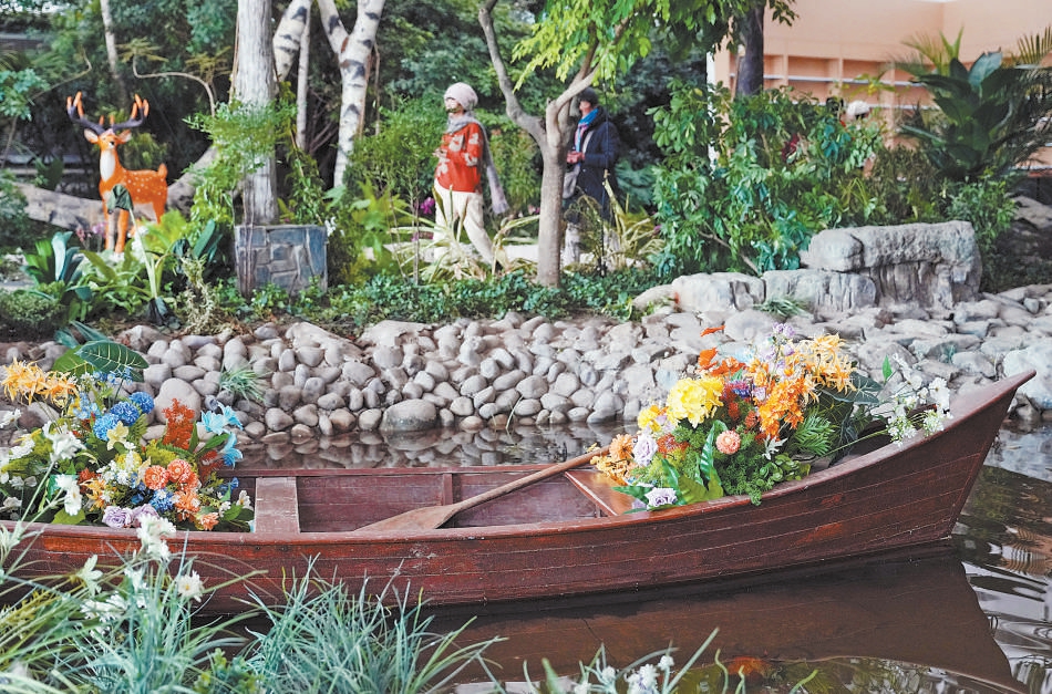 移步书店花园,高高低低的花树映入眼帘。这里是一座温室花园,中心有个小湖,一艘小船上满是鲜花,再加上瀑布流泉,动静相宜。树木自然地围合成一个个小空间,各种造型的桌椅摆放其间,人们既可与书本独处,沉浸于花香与文字交织的静谧;也可与友相伴,在绿意掩映中享受松弛交谈,构建起兼具自然气息与文化氛围的独特空间。