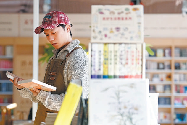 在充满书香与绿植的书店里,年轻店员乐观而认真的神情更增添了些许温馨与宁静。
