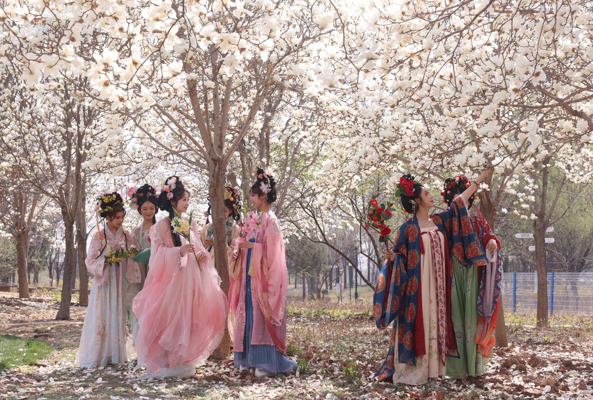 3月31日,北京国际鲜花港,扮演花神的女生漫步玉兰花间。记者 李木易 摄