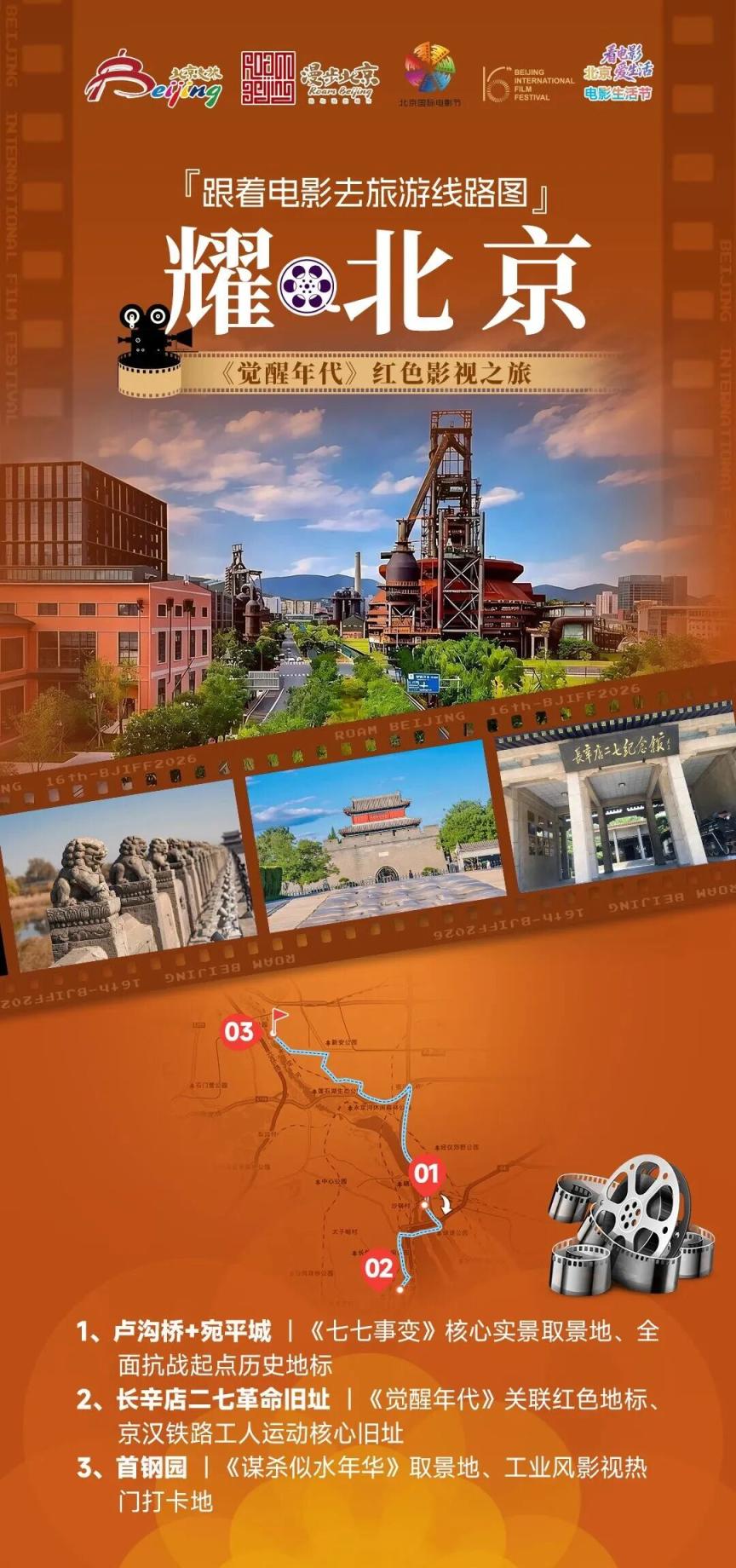 线路解说:这条红色光影线路串联京城三大红色文旅地标,沉浸式重温家国史诗。驻足卢沟桥与宛平城,触摸《七七事变》的历史印记,感受民族抗争的铮铮铁骨和燃情烽火;探访长辛店二七革命纪念馆,追寻《觉醒年代》先辈足迹,感悟早期革命的热血信仰;漫步首钢园,在百年工业遗址中打卡《谋杀似水年华》同款场景,让青春记忆与光影记忆交织。